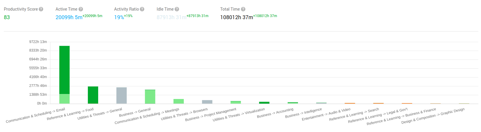 Meanwhile, Categories Distribution shows where time is being spent across different tools and workflows, helping organizations identify inefficiencies caused by overlapping platforms or underperforming systems. This turns raw usage data into actionable intelligence that can inform both IT investments and process optimization initiatives.