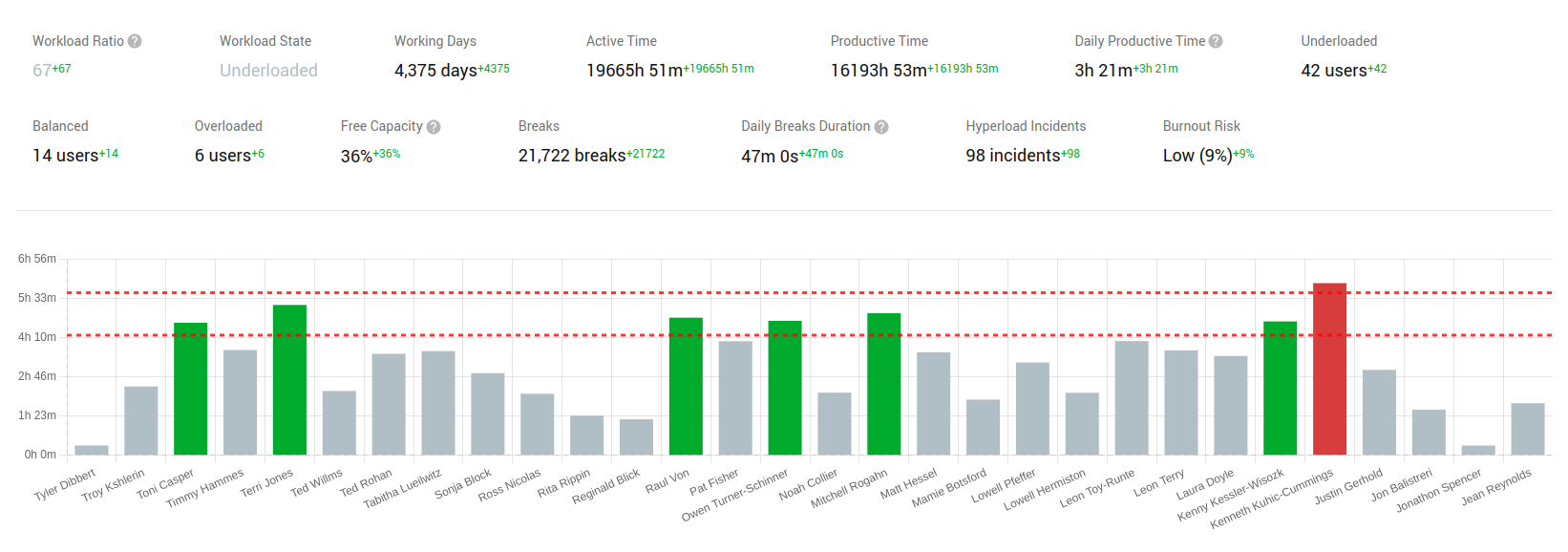 Burnout indicators are particularly powerful when tied to financial models. Controlio tracks Hyperload incidents, stretches of consecutive overloaded days that increase burnout risk, and calculates a burnout risk ratio.