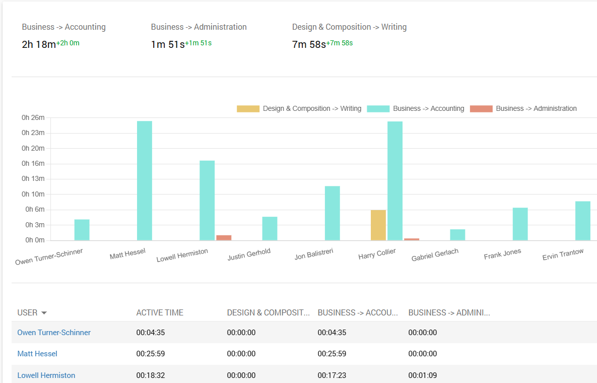 Receive an objective comparison across individual employees, or entire departments based on the activity categories they engage in to learn more about their roles demands.