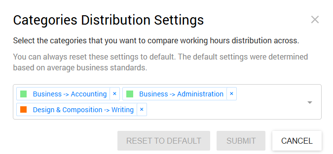 By default the selected categories will be Business - Accounting, Business - Administration, and Design & Composition - Writing