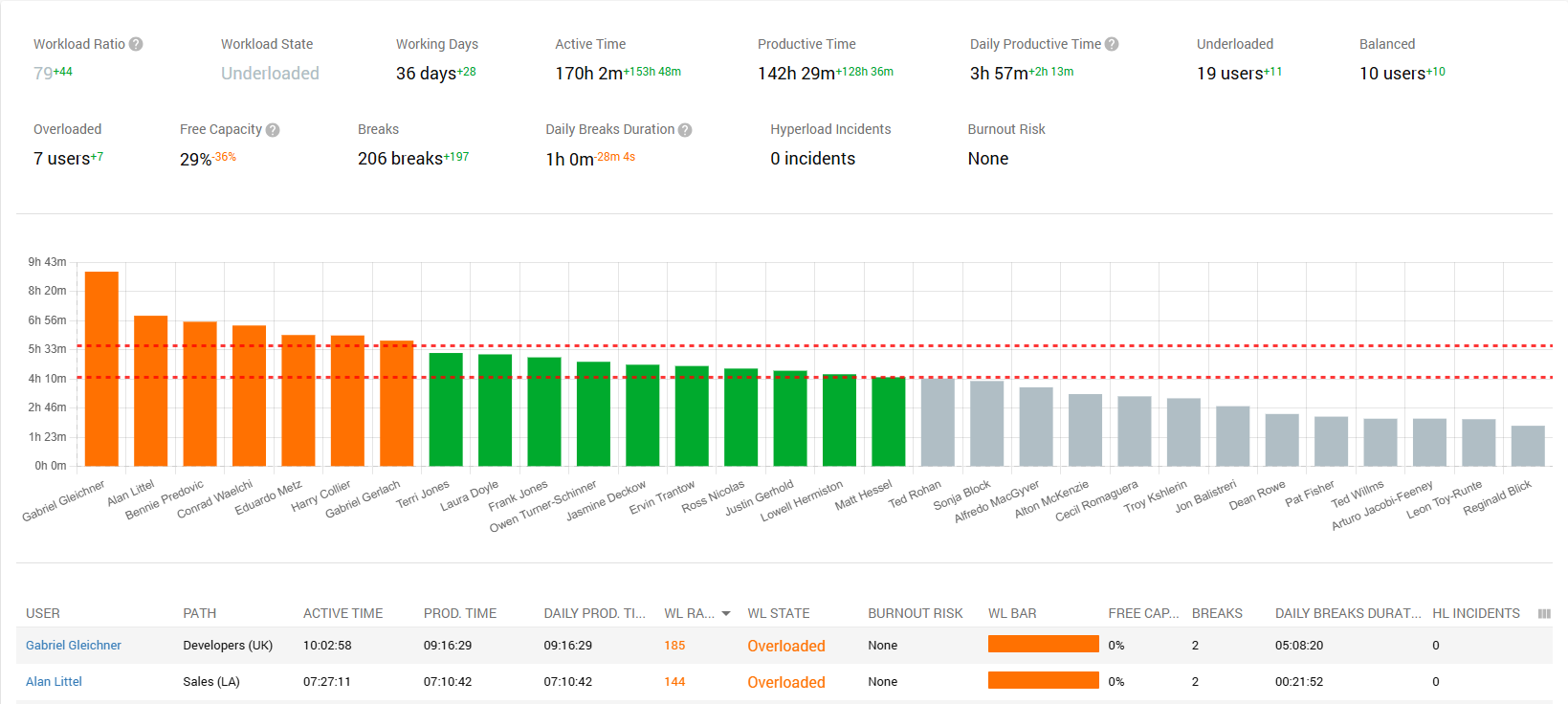 Get a high level summary of employees average productive time, number of breaks, and average break duration. Find out how many of your employees are underloaded, overloaded, maintaining a balanced workload, or at risk of burnout.