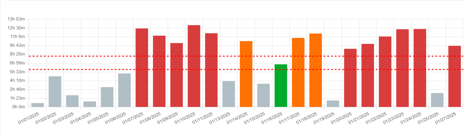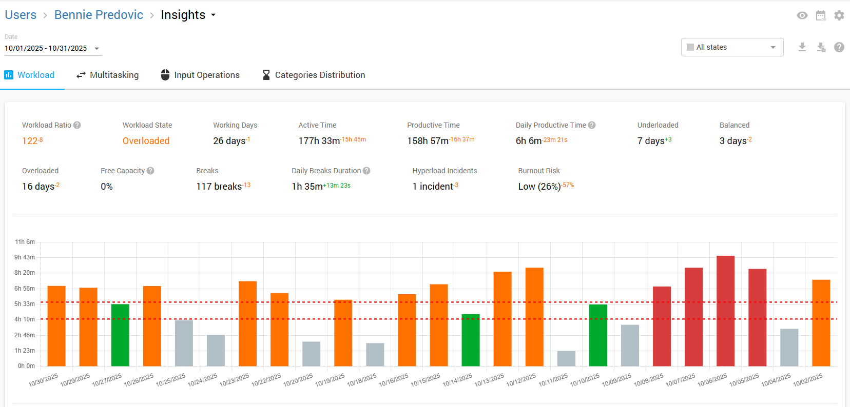 - Red: Burnout Risk: If the percentage of productive time worked on hyperloaded days exceeds the burnout risk threshold relative to the target productive time goal, the employee is considered at risk of burnout. It is recommended to use this metric with at least 20 working days for it to be more meaningful.