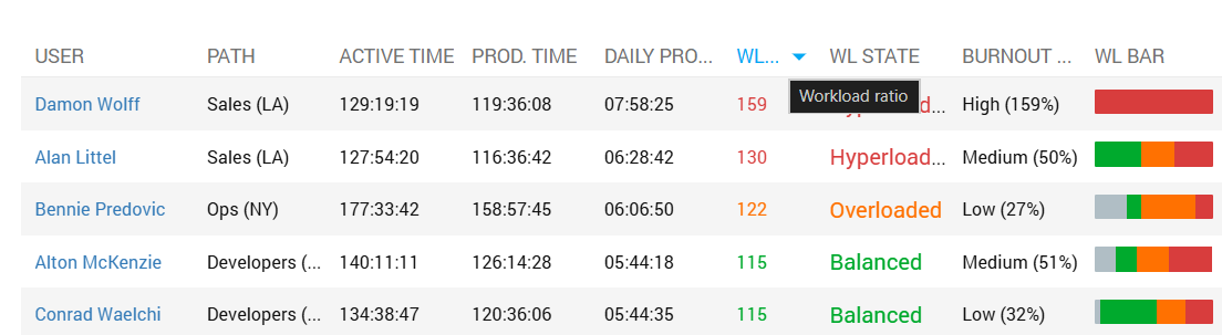 The workload is determined using the goal specified in the Workload Settings (By default ~5 hours of productive time). Employees with fewer productive hours than this threshold are viewed as underloaded, while those within the target range are considered balanced. If their productive hours surpass the threshold, it suggests they are overloaded or potentially at risk of burnout.