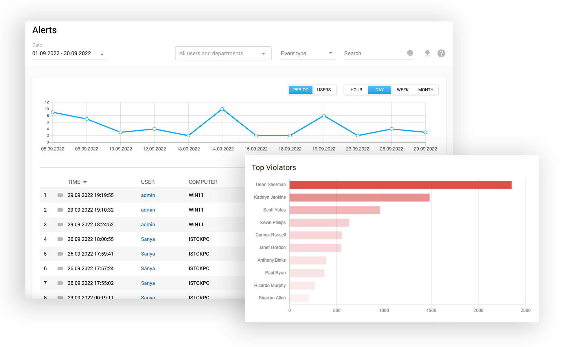 Respond to modern cybersecurity challenges with strong protective measures based on reliable User and Entity Behavior Analytics. Use smart Controlio’s algorithms, comprehensive statistics, and advanced data processing to shield your business from insider and outsider threats.
